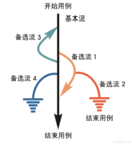 备选流用不同的彩色表示,一个备选流可能从基本流开始,在某个特定条件下执行,然后重新加入基本流中(如备选流 1 和 3);也可能起源于另一个备选流(如备选流 2),或者终止用例而不再重新加入到某个流(如备选流 2 和 4)。